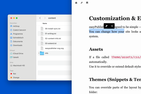 easyPublisher is a lightweight publishing tool, ideal for authors who want to focus entirely on their content – without any technical overhead. Its file-based structure allows you to start working with Markdown files right away and completely avoids complex setups or databases.