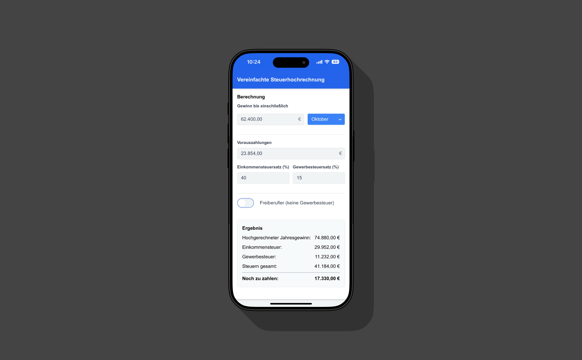 Another important step was to set up the tool as a Progressive Web App (PWA)1 . This made it available not only through the browser but also usable on mobile devices like a native app. A special feature is that custom tax rates and the freelancer toggle are stored locally. This means these settings are retained even after restarting the app, so users don’t have to enter them every time.