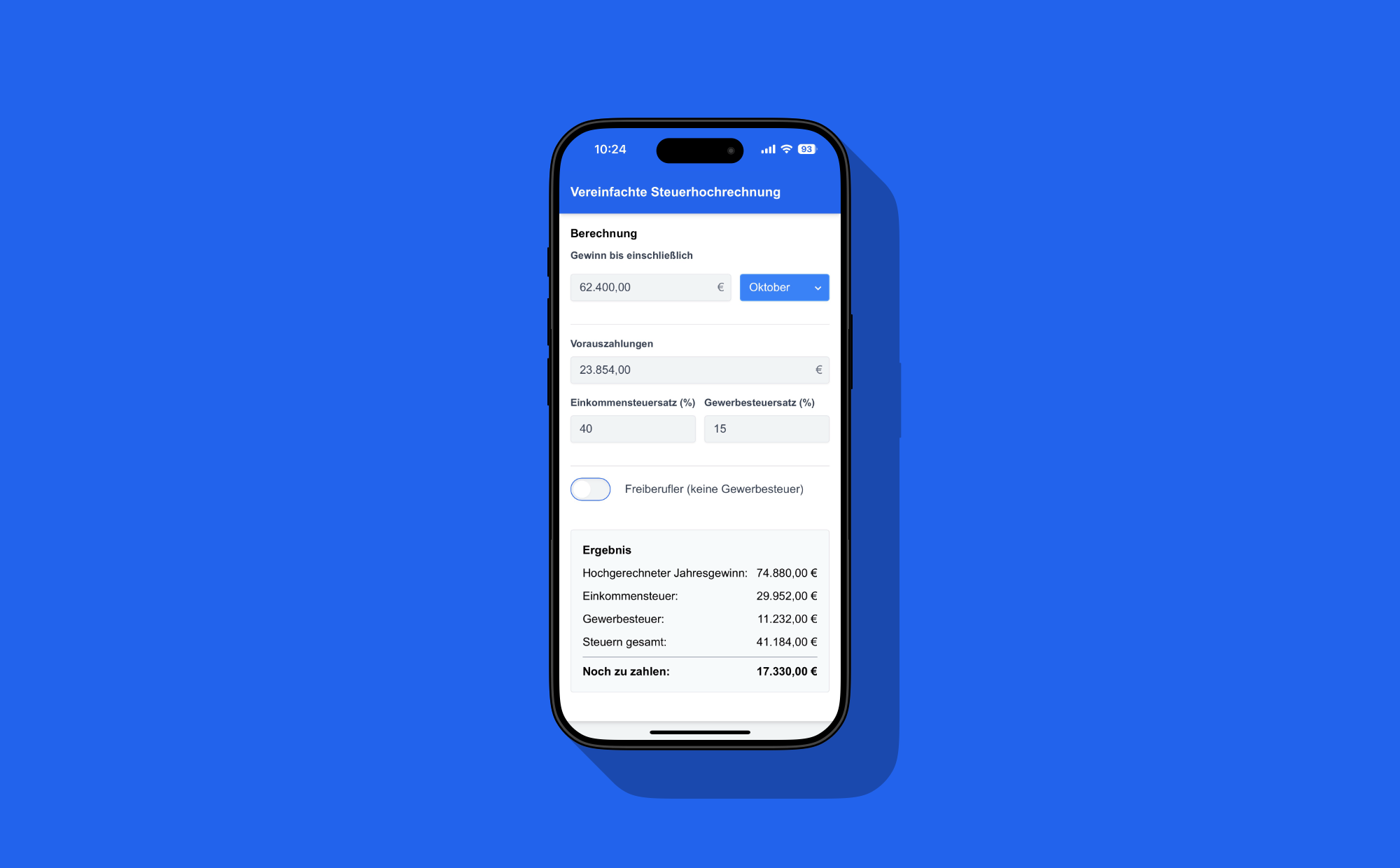 - Freiberufler-Toggle: Freiberufler, die keine Gewerbesteuer zahlen, können diese aus der Berechnung ausschließen, indem sie den entsprechenden Schalter umlegen. Die Berechnung wird sofort aktualisiert.