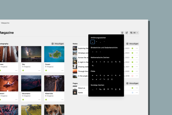 Typo & Paste erleichtert den Zugriff auf Sonderzeichen im Kirby CMS und stellt sicher, dass typographische Standards eingehalten werden. Entwickle dein eigenes Set an Sonderzeichen für Anwender – schnell und flexibel konfigurierbar.