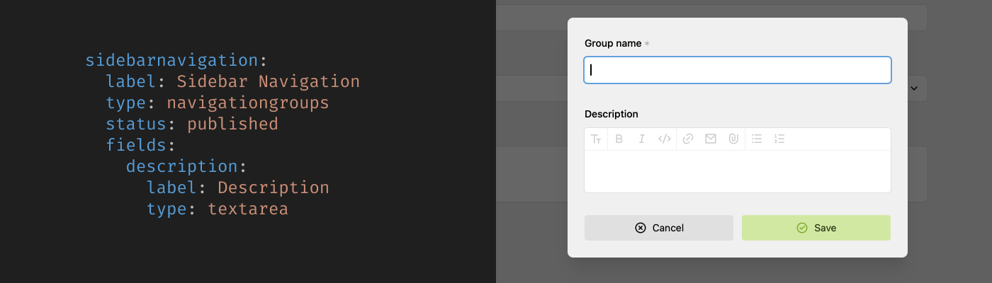 Ein besonderes Feature ist die Möglichkeit, Gruppenfelder über das Blueprint zu erweitern. Neben dem Standardtitel können so zusätzliche Informationen wie Beschreibungen, Icons oder andere Metadaten hinzugefügt werden. Diese Flexibilität ermöglicht es, die Gruppen an spezifische Anforderungen eines Projekts anzupassen und die Navigation noch aussagekräftiger zu gestalten.